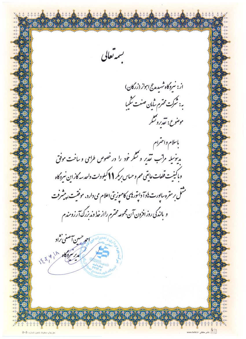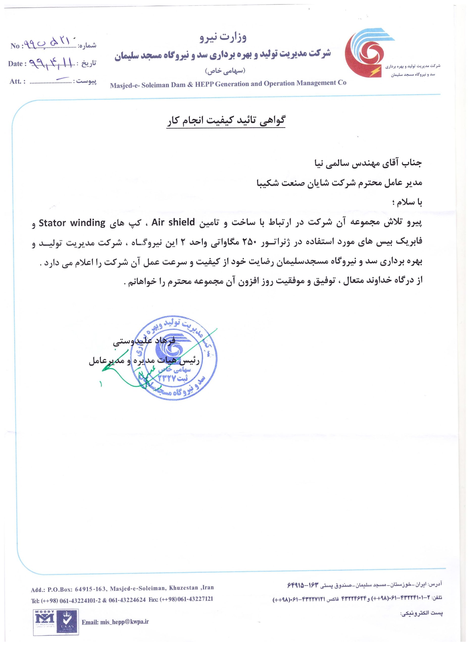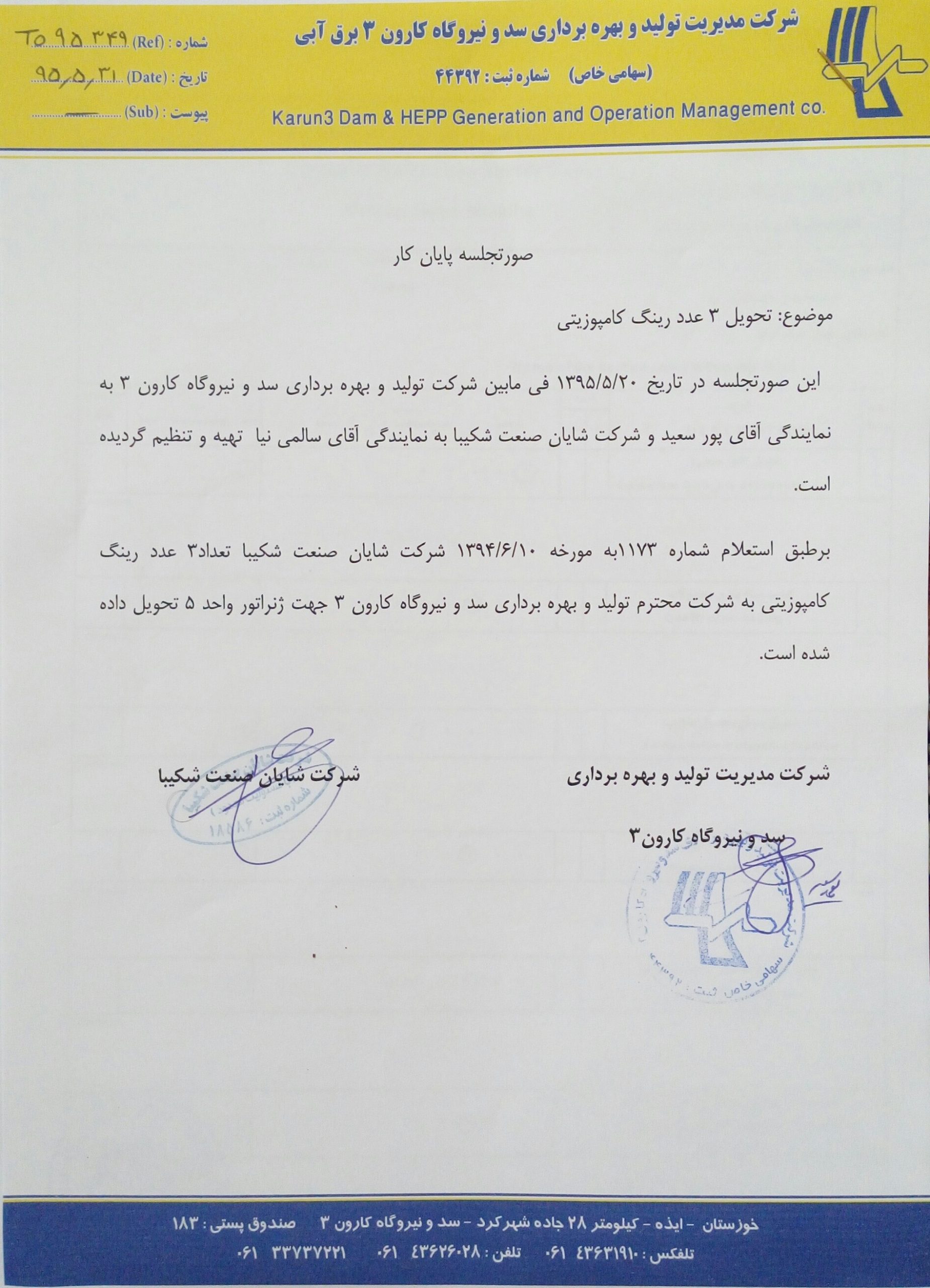 شرکت شایان صنعت افتخار همکاری با مجموعههای بزرگ صنعتی و نیروگاهی کشور را در زمینه طراحی و ساخت قطعات کامپوزیتی، عایقهای الکتریکی و تجهیزات مکانیکی داشته است